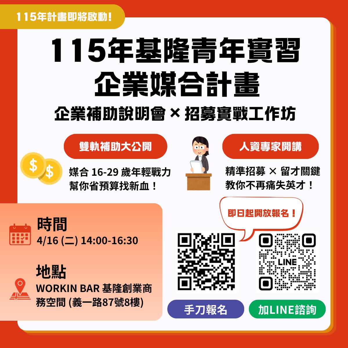 115年基隆青年實習企業媒合計畫 官方LINE:https://lin.ee/nqDGDGE ​ (@723pxaoj)